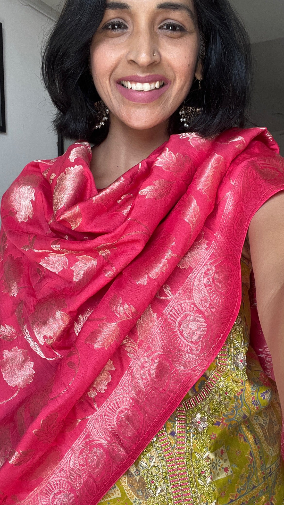 Super soft silk unstitched suit set with beautiful florals prints all over the top front and back with intricate embroidered work on the neck, clubbed with a beautiful Banarasi dupatta