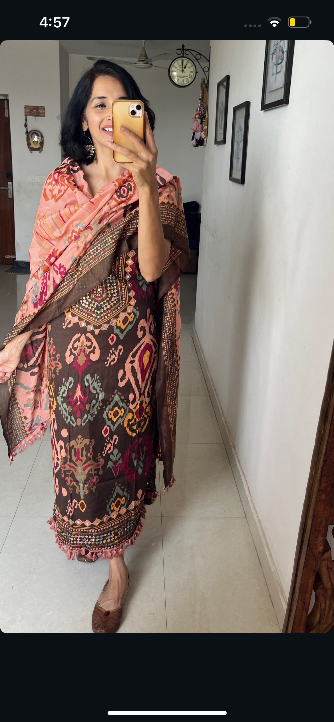 Mirror work cotton printed suit set with print on front as well as back and sleeves. enhamced with tassels on shirt borders. paired with beautiful printed contrast dupatta.