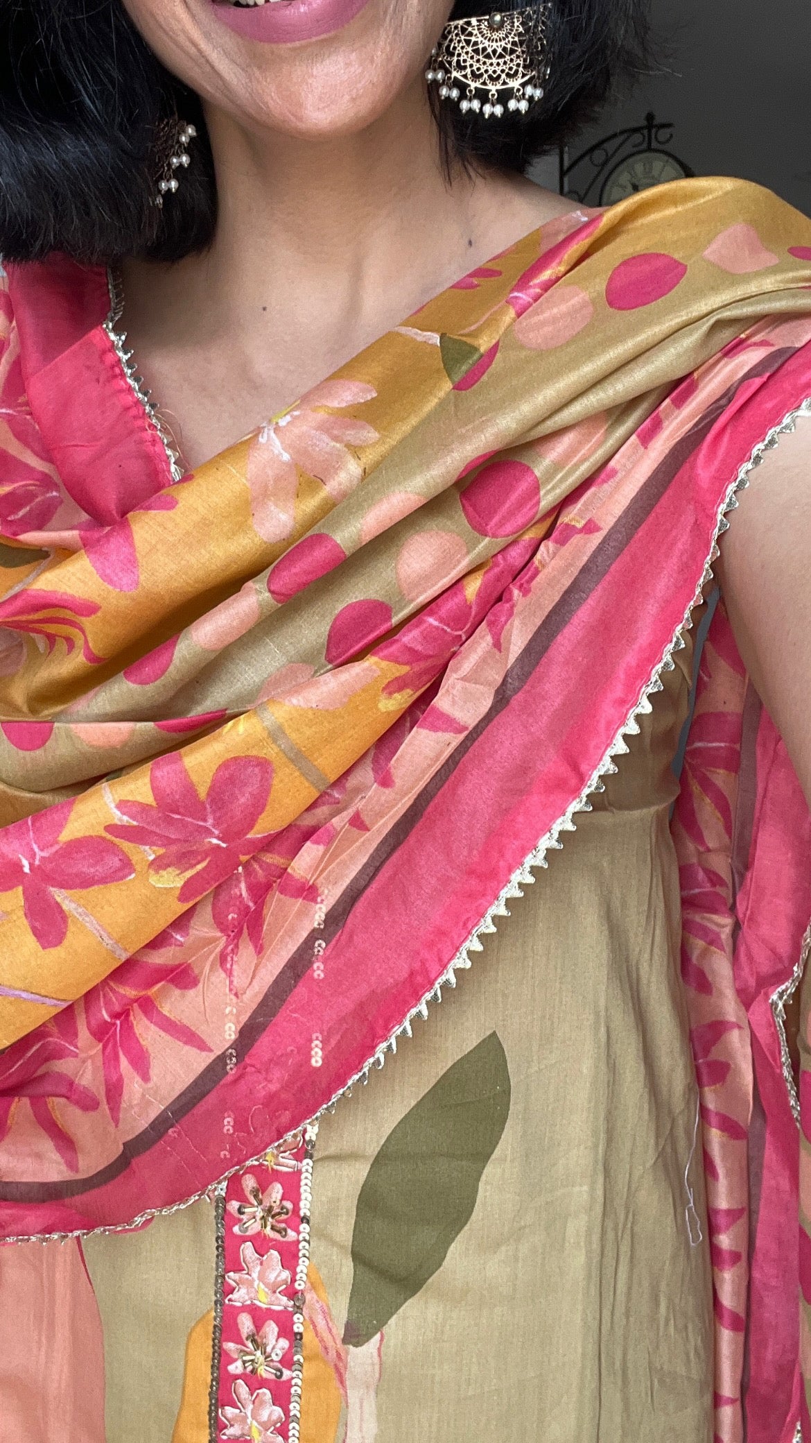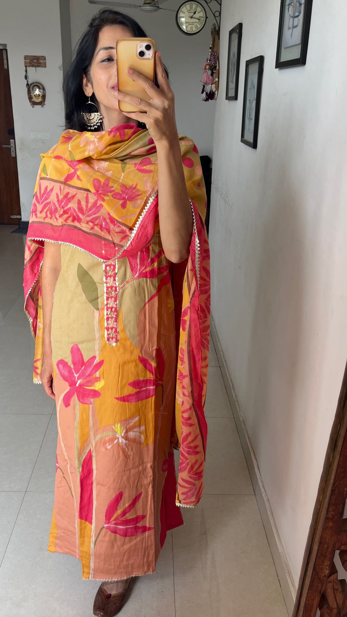 Super soft Pure Muslin unstitched suit set with beautful florals prints all over the top with intricate embroidered lace work on the neck, clubbed with a beautiful printed dupatta